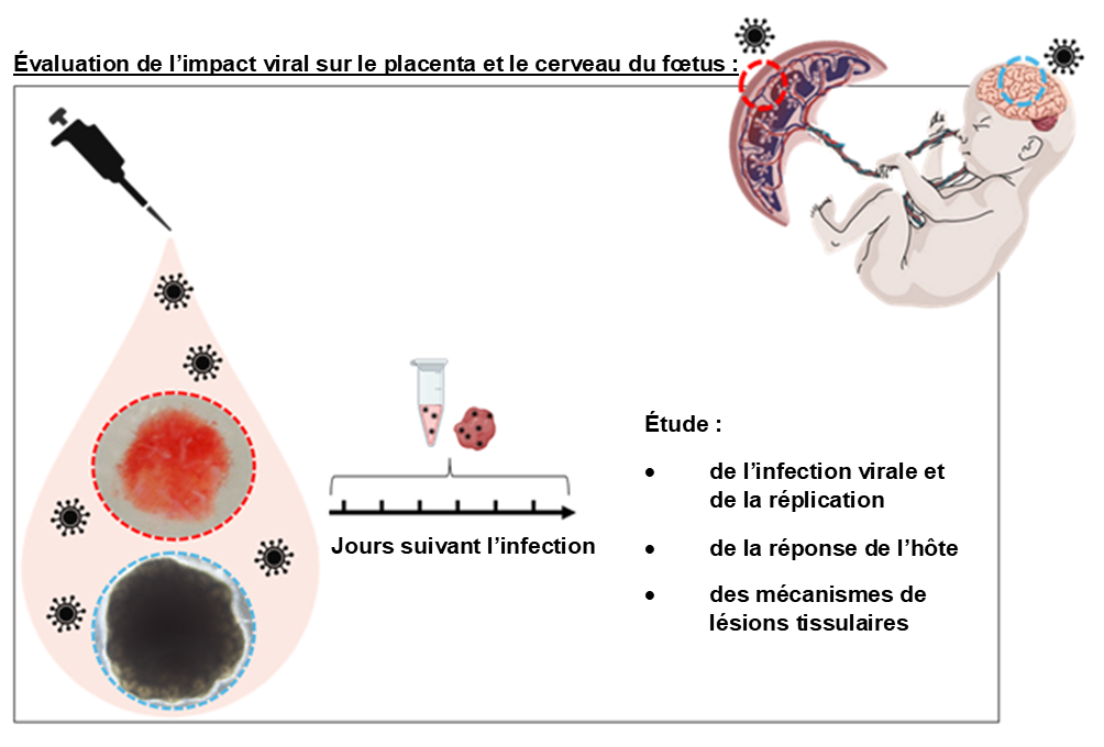 Pour comprendre les mécanismes en jeu, il est nécessaire de disposer des modèles in vitro humains reproduisant fidèlement les infections virales dans les tissus placentaires et cérébraux fœtaux. Pour ce faire, nous avons utilisé des modèles sophistiqués tels que des explants de placenta humain et des organoïdes de cerveau pour étudier les infections par le SARS-CoV-2, le virus du Nil occidental (VNO) et le virus Zika (ZIKV). Ces modèles nous ont permis d’étudier le tropisme cellulaire, la propagation virale, ainsi que la caractérisation des réponses de l’hôte à l’infection.