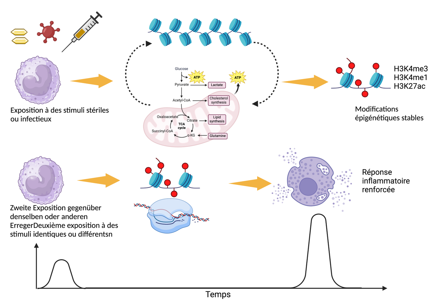 Notre corps dispose de deux moyens de défense coordonnés qui nous protègent contre les agents pathogènes. Pendant longtemps, on a pensé que seule la partie adaptative du système immunitaire était capable de mémoriser l’exposition à un agent pathogène et d’induire une réponse plus forte lors d’une nouvelle rencontre avec cet agent. Toutefois, plusieurs séries d’études in vitro et in vivo ont récemment démontré que les cellules de l’immunité innée sont également capables de développer une mémoire en réponse à certains motifs moléculaires associés à des agents pathogènes (PAMP) ou à des dommages (DAMP). Par un processus mécanique, une exposition passagère des cellules de l’immunité innée (par ex. macrophages, cellules NK, cellules dendritiques) à certains PAMP et DAMP entraîne une modification à long terme du paysage épigénétique et métabolique des cellules. Ces modifications altèrent la façon dont les cellules de l’immunité innée répondent plus tard face à des stimuli identiques ou différents. Ces cellules peuvent réagir de deux manières opposées : soit elles s’entraînent, ce qui se caractérise par un état d’hyperréactivité, soit elles se montrent tolérantes et se placent alors dans un état d’hyporéactivité.