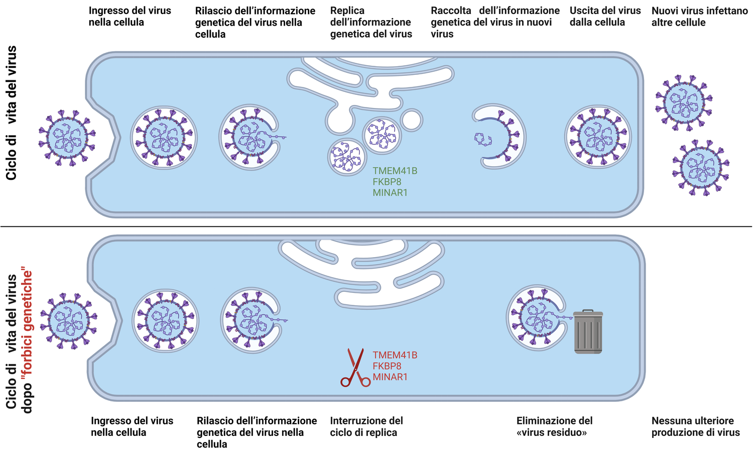 Utilizzando le forbici genetiche, abbiamo identificato i 3 fattori «TMEM41B, FKBP8 e MINAR1» come importanti per l’infezione da SARS-CoV-2. Queste nuove conoscenze hanno portato a una migliore comprensione del virus nella cellula.